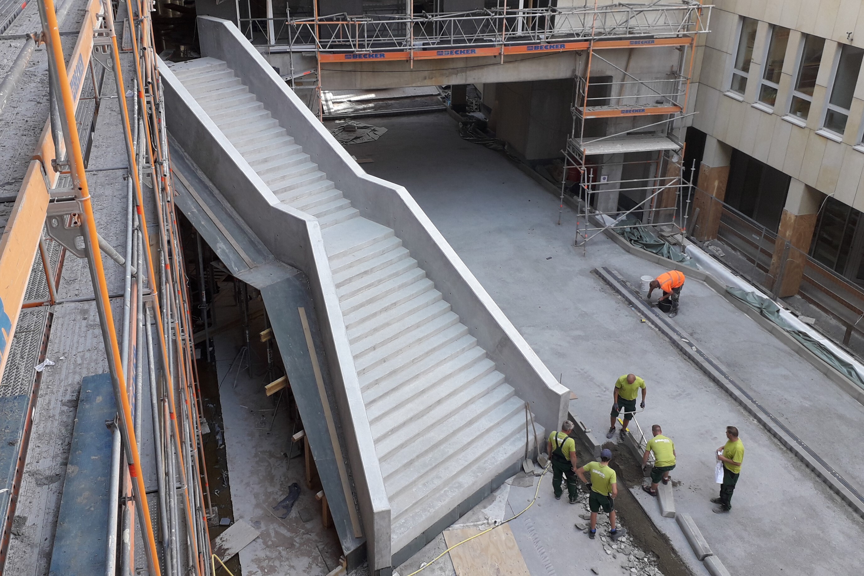 Die Neubauten wurden in Stahlbetonbauweise mit weitgespannten schlanken Decken und einem stark aufgelösten und den unterschiedlichen Nutzungen entsprechenden Tragwerk aus Stützen, Unterzügen und Wandscheiben geplant. Für Anlieferverkehr ist die befahrene TG-Decke in die Brückenklasse 30/30 eingestuft. Der für die Öffentlichkeit zugängliche Innenhof wurde extensiv begrünt, erhielt eine starke Terrassierung und dient als Aufenthaltsort und Ruhezone.
